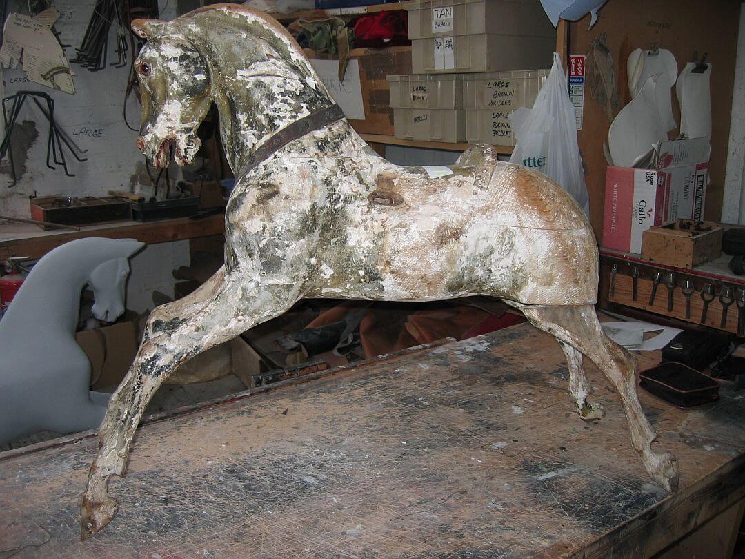 Sometimes a horse will have a loose fitting or broken leg and so a new leg might be made or the original one re-glued. The remaining paintwork may be so original and in such good condition that conserving this original dappling might be advised.